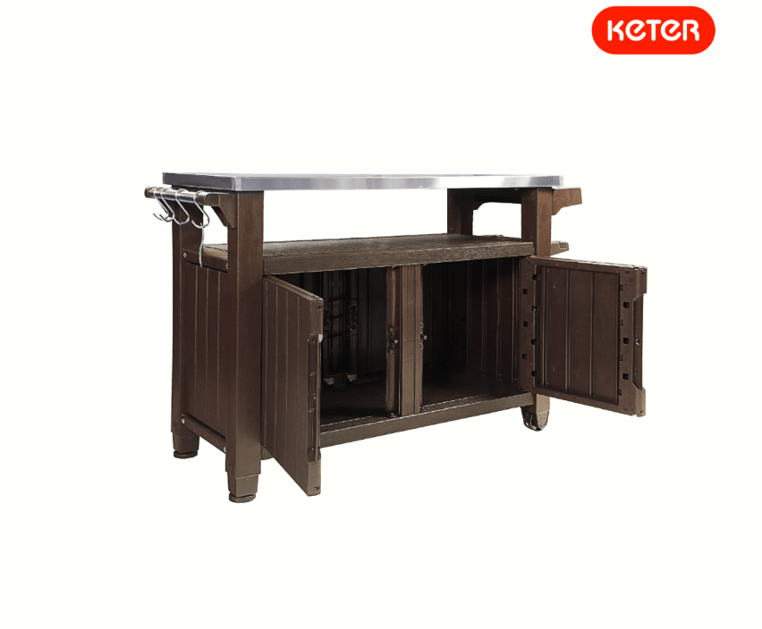 Stalas griliui UNITY XL 207 L yra moderni, mobili daiktadėžė specialioms užduotims! Talpi dviejų durų spintelė su funkcionaliu nerūdijančio plieno stalviršiu ir patogi rankena su kabliukais rankšluosčiams, tiks rengiant didelius šeimos susitikimus terasoje ar sode. Joje laisvai sutilps indai, maisto produktai, gėrimai, virtės reikmenys ir daug kitų daiktų, reikalingų rengiant vakarienes ar barbekiu.