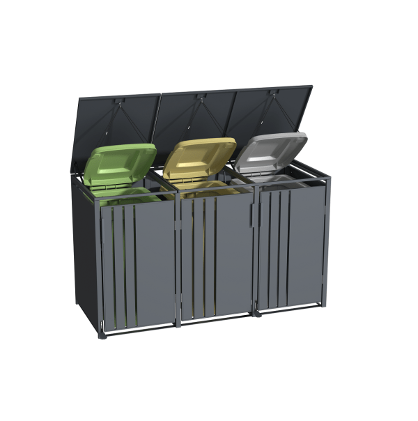Pastogė pagaminta iš milteliniu būdu dengto plieno, todėl yra tvirta, atspari oro sąlygoms ir ilgaamžė. Joje telpa net trys konteineriai iki 240 litrų, o specialus kabliukas su virvute leidžia patogiai pakelti konteinerio dangtį jo neliečiant.